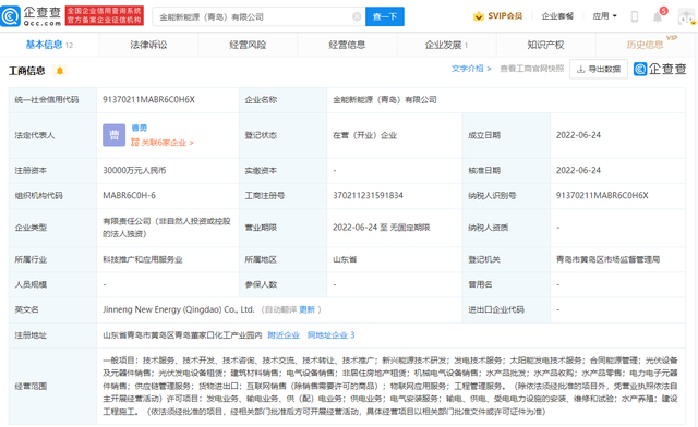 数据显示,6月24日,金能新能源(青岛)有限公司成立,法定代表人为曹勇,注册资本3亿元人民币,经营范围包含:新兴能源技术研发;发电技术服务;太阳能发电技术服务;合同能源管理;光伏设备及元器件销售;电气设备销售等。股权穿透显示,该公司由金能科技(603113)间接全资持股。