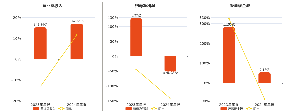 公司营业总收入为162.65亿元。归母净利润为-5787.29万元,较去年同报告期归母净利润减少1.95亿元,同比较去年同期下降142.13%。经营活动现金净流入为2.17亿元,较去年同报告期经营活动现金净流入减少9.37亿元,同比较去年同期下降81.23%。