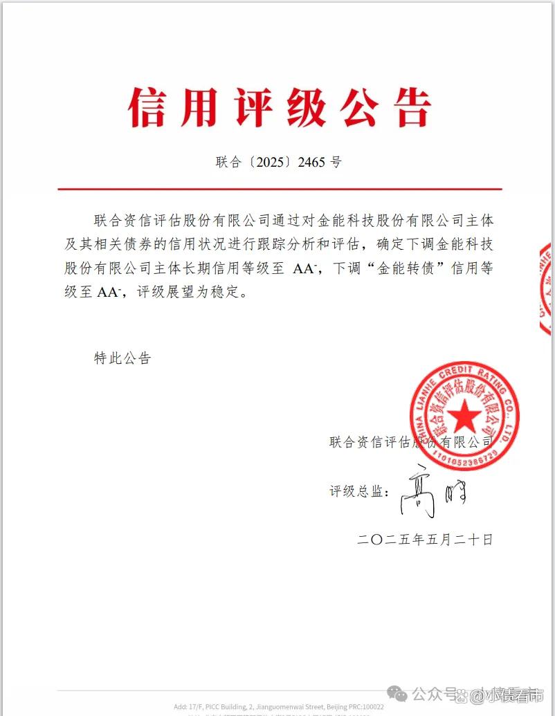 5月20日,联合资信将金能科技(603113.SH)主体长期信用等级从AA下调至 AA-,并下调“金能转债”信用等级至AA-,评级展望为稳定。
