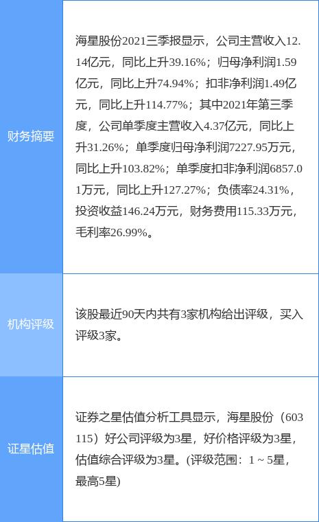 海星股份披露年报,公司2021年实现营业收入为16.45亿元,同比增长35.01%;归母净利润2.21亿元,同比增长75.87%;基本每股收益1.05元。公司拟每10股派发现金股利7.5元(含税)。