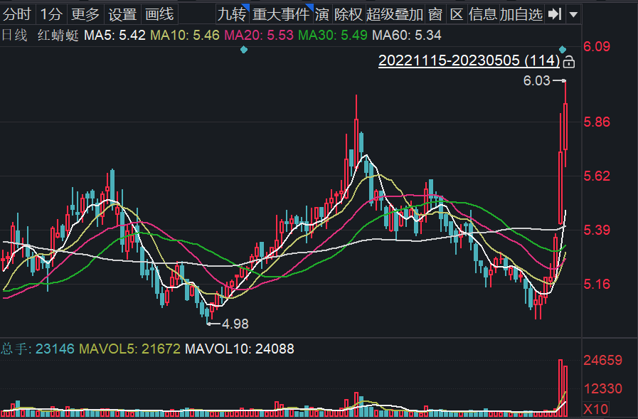 或部分由于红蜻蜓的大手笔分红计划吸引了A股市场投资者,在2022年财报及分红计划发布后的第一个交易日-5月4日,公司股票盘中一度涨停,交易总手数为近半年之最。5月5日,公司股价继续上涨,并触及近半年来高点。