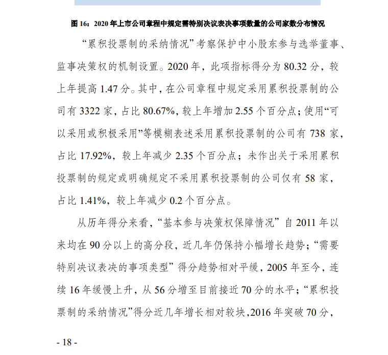 中国证券投资者保护基金公司发布的《中国资本市场投资者保护状况蓝皮书—A股上市公司投资者保护状况评价报告(2021)》显示,2020年度,在公司章程中规定采用累积投票制的公司有3322家,占比80.67%,较上年增加2.55个百分点;使用“采用或积极采用”等模糊表述采用累积投票制的公司738家,占比17.92%,较上年较少2.35个百分点;未作出关于采用累积投票制的规定或明确规定不采用累积投票制的公司仅有58家,占比1.41%,较上年减少0.2个百分点。