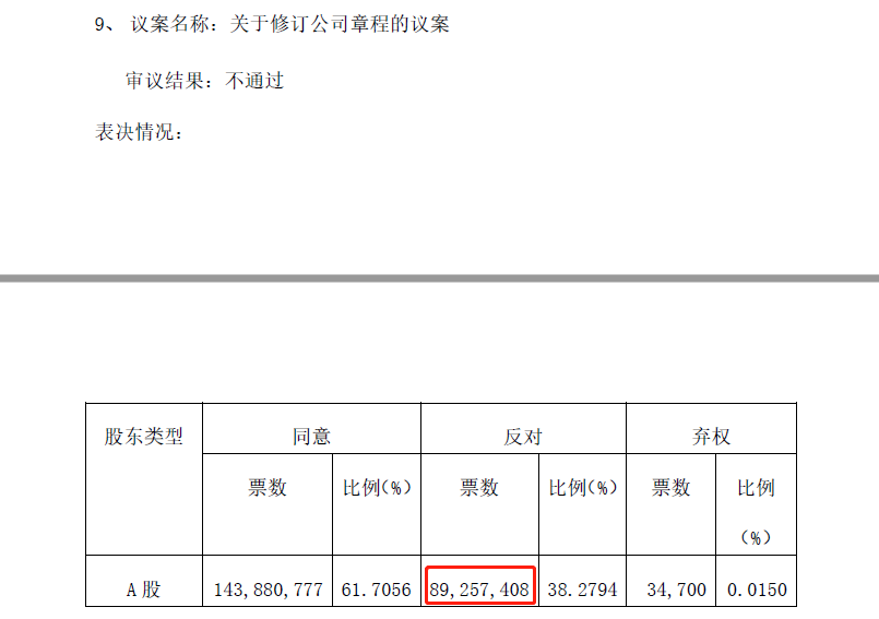 上述议案的表决结果为同意1.44亿股,占出席会议的股东所持有表决权的股份总数的61.7056%;反对8925.74万股,占比38.2794%;弃权3.47万股,占比0.015%。5%以下股东的表决情况为:同意982.57万股,反对1497.7万股,弃权3.47万股。