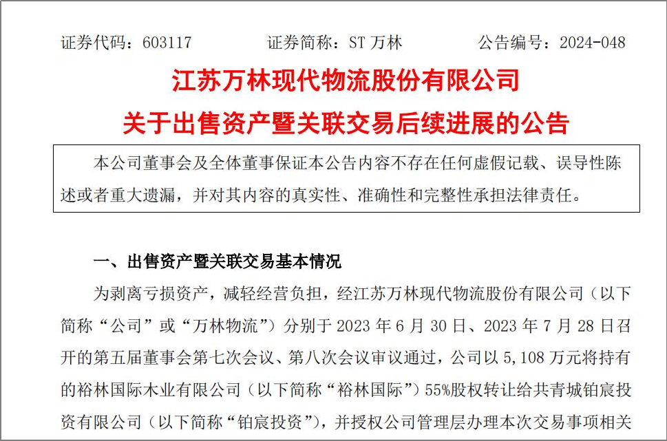7月8日晚间,江苏万林现代物流股份有限公司(证券简称:ST万林,证券代码:603117,以下称“万林物流”)发布公告,披露了其出售资产暨关联交易的后续进展情况。