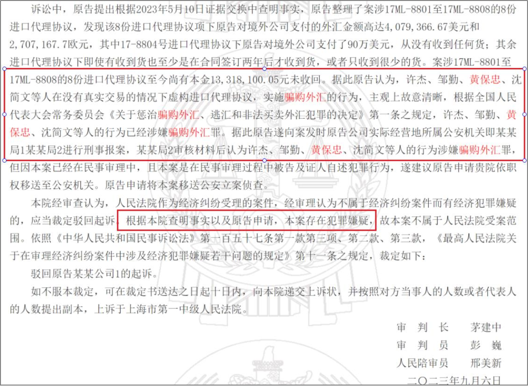 法院在审理过程中,发现了原实控人黄保忠不仅有相关经济纠纷,还可能涉嫌涉嫌骗购外汇罪。根据《中华人民共和国刑事诉讼法》第一百一十二条之规定,上海公安徐汇分局决定对相关骗购外汇案立案侦查。