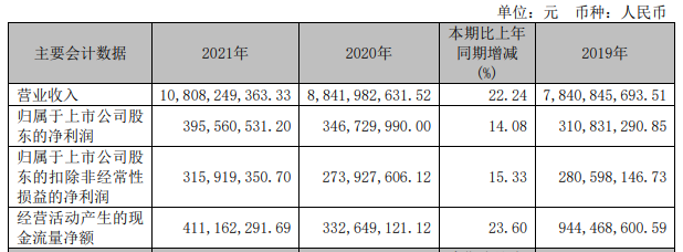 年,公司积极应对各种挑战,全年销售额突破百亿大关,净利润稳健增长,进一步巩固了公司在行业中的龙头地位。报告期内,公司实现营业收入 108.08亿元,同比增长 22.24%;实现归属于上市公司股东的净利润 3.96亿元,同比增长14.08%。