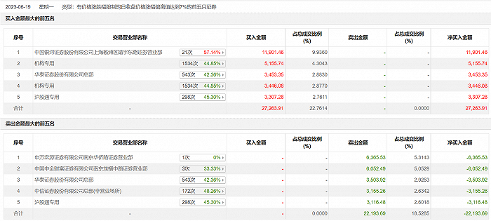 共进股份今日涨停,龙虎榜数据显示,上榜营业部席位全天成交4.95亿元,占当日总成交金额比例为41.29%。其中,买入金额为2.73亿元,卖出金额为2.22亿元,合计净买入5070.23万元。