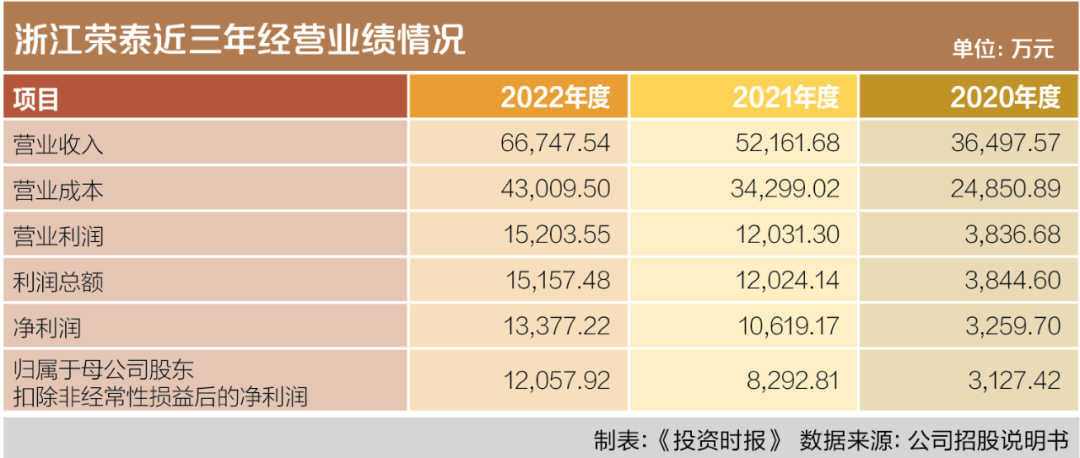 2020年至2022年(下称报告期),随着汽车行业整体智能化水平的提高,单车电子元件数量大幅度增加,云母耐高温绝缘材料在自动驾驶模块安全结构件、输电线束以及充电设备等更多汽车模块中获得应用,浙江荣泰也通过云母制品的销售,实现了经营规模的迅速扩大和业绩的显著提升。报告期内,该公司营业收入分别为3.65亿元、5.22亿元、6.67亿元;净利润分别为0.33亿元、1.06亿元和1.34亿元,业绩稳步提升。