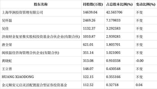 半年报显示,2022年上半年末的公司十大流通股东中,持股最多的为上海华涧投资管理有限公司,占比42.57%。十大流通股东名单相比2022年一季报维持不变。在具体持股比例上,金元顺安元启灵活配置混合型证券投资基金持股有所上升,黄晓虹持股有所下降。