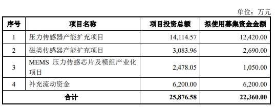 本次以简易程序向特定对象发行股票募集资金总额不超过22,360.00万元(含本数),符合以简易程序向特定对象发行股票的募集资金不超过人民币三亿元且不超过最近一年末净资产百分之二十的规定;在扣除相关发行费用后的募集资金净额拟投资于以下项目:压力传感器产能扩充项目、磁类传感器产能扩充项目、MEMS压力传感芯片及模组产业化项目、补充流动资金。