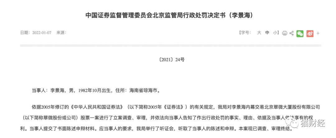 1月7日,北京监管局披露了一则针对李景海的行政处罚决定书,从决定书来看,李景海由于涉嫌内幕交易翠微股份股票,被没收违法所得473.94万元,并处罚款1421.81万元。