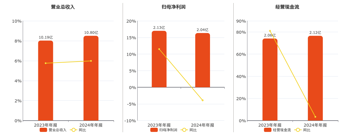 公司营业总收入为10.80亿元。归母净利润为2.04亿元,较去年同报告期归母净利润减少833.33万元,同比较去年同期下降3.92%。经营活动现金净流入为2.12亿元。