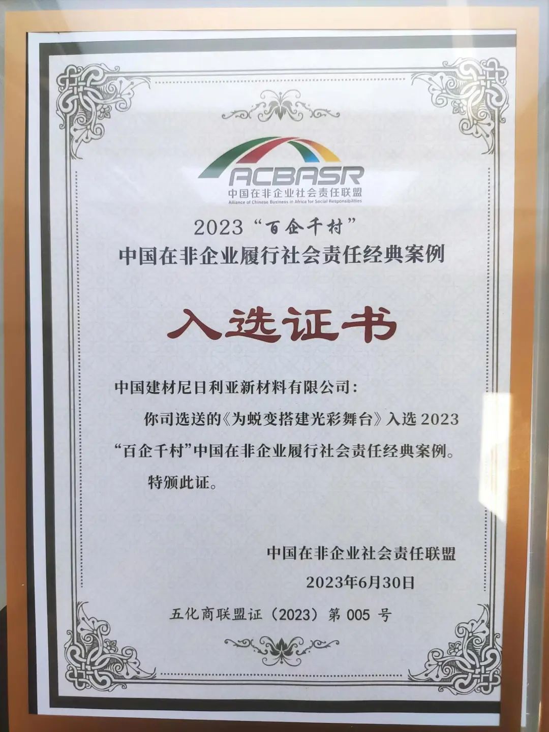 习近平总书记在中非合作论坛第八届部长级会议上宣布了中非合作“九项工程”,中国在非企业社会责任联盟主办的“百企千村”活动是其中一项重要创新举措。中材尼日利亚选送案例《为蜕变搭建光彩舞台》成功入选《2023“百企千村”中国在非企业履行社会责任经典案例》。此次入选,是对中材尼日利亚在非洲积极履行社会责任,促进当地经济、社会和环境协调发展所作努力的充分认可。
