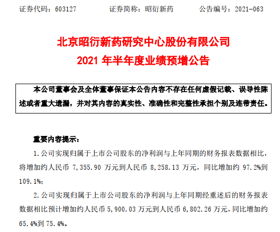中国经济网北京8月10日讯昨日晚间,昭衍新药(603127.SH)发布2021年半年度业绩预增公告。公司财务部门初步测算如下,预计2021年1-6月实现归属于上市公司股东的净利润约为人民币14922.38万元到人民币15824.61万元之间,与上年同期的财务报表数据相比,将增加约人民币7355.90万元到人民币8258.13万元,同比增加约97.2%到109.1%;预计2021年1-6月归属于上市公司股东的扣除非经常性损益的净利润与上年同期的财务报表数据相比,将增加约人民币6090.59万元到人民币6992.83万元,同比增加约95.0%到109.1%。