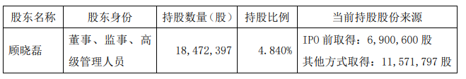 昭衍新药董事顾晓磊及其一致行动人顾美芳目前分别持有公司股份1847.24万股、1387.13万股,持股比例分别为4.840%、3.635%。二人合计持股3234.37万股,持股比例为8.475%。上述股份来源于首发前限售股份及公司资本公积金转增股份等其他方式。