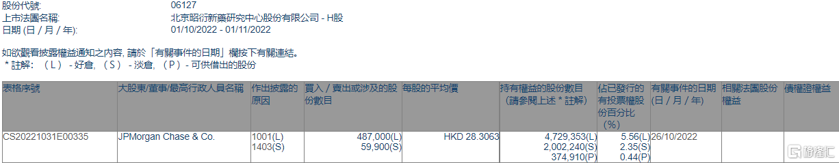 格隆汇11月1日丨根据联交所最新权益披露资料显示,2022年10月26日,昭衍新药(06127.HK)获JPMorgan Chase & Co.以每股均价28.3063港元增持好仓48.7万股,涉资约1378.52万港元。