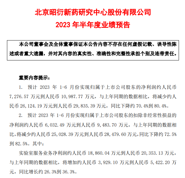 近日,昭衍新药发布2023年半年度业绩预告,称预计上半年营业收入约9.73-10.51亿元,同比增长约25.3%-35.3%;归母净利润约0.73-1.1亿元,同比下降约70.4%-80.4%;扣非净利润约0.6-0.95亿元,同比下降约72.5%-82.5%。