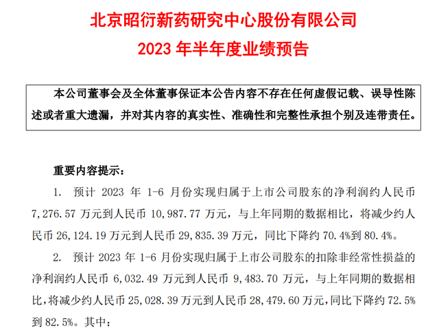 本次股价波动的主要原因在于并不亮眼的半年报预告。根据昭衍新药近日发布的2023年上半年业绩预告,预计实现归母净利润约为0.73亿元~1.1亿元,同比下降约70.4%~80.4%;实现扣非净利润约0.6亿元~0.95亿元,同比下降约72.5%~82.5%。