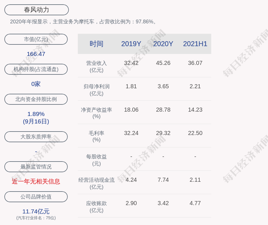 2020年年报显示,春风动力的主营业务为摩托车,占营收比例为:97.86%。