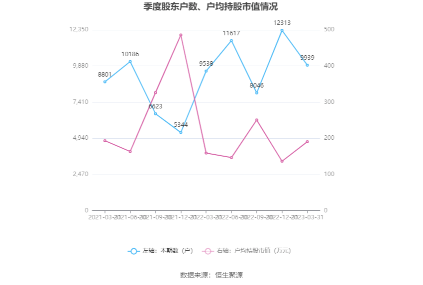 筹码集中度方面,截至2023年一季度末,公司股东总户数为9939户,较上年末下降了2374户,降幅19.28%;户均持股市值由2022年末的136.92万元上升至190.84万元,增幅为39.38%。
