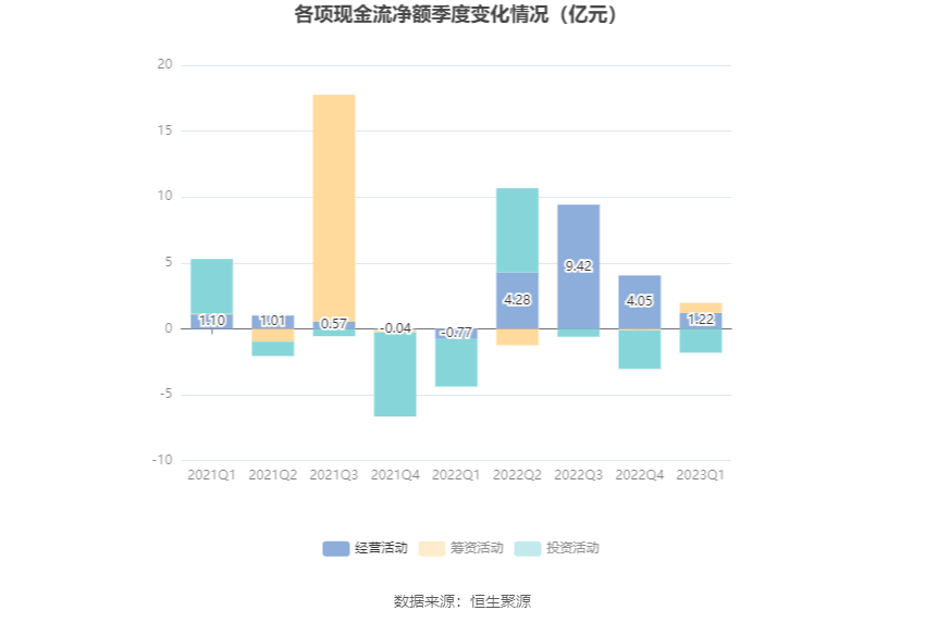 截至2023年一季度末,公司经营活动现金流净额为1.22亿元,同比增加1.99亿元,环比下降69.88%;筹资活动现金流净额7482.58万元,较上年一季度末增长7292.42万元;投资活动现金流净额-1.81亿元,上年同期为-3.61亿元。