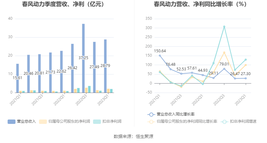 春风动力(603129)4月12日披露2023年第一季度报告。报告期内公司实现营业总收入28.79亿元,同比增长27.30%;归母净利润2.10亿元,同比增长99.57%;扣非净利润1.96亿元,同比增长128.79%;经营活动产生的现金流量净额为1.22亿元,上年同期为-7740.52万元;报告期内,春风动力基本每股收益为1.4元,加权平均净资产收益率为4.78%。