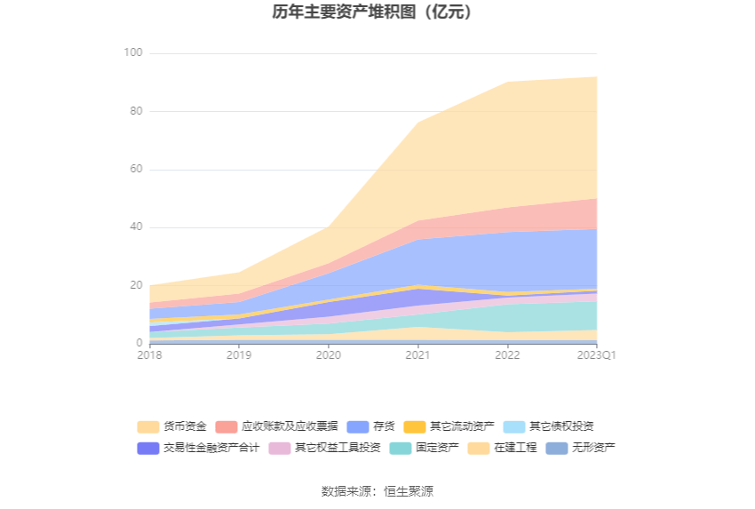 资产重大变化方面,截至2023年一季度末,公司货币资金较上年末减少3.10%,占公司总资产比重下降2.05个百分点;应收账款较上年末增加24.00%,占公司总资产比重上升1.97个百分点;在建工程较上年末增加28.17%,占公司总资产比重上升0.75个百分点;存货较上年末减少0.69%,占公司总资产比重下降0.47个百分点。