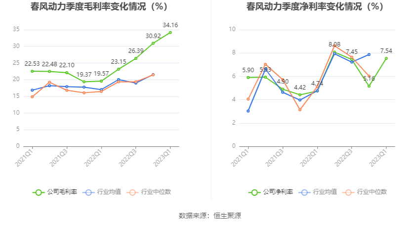 数据显示,2023年一季度,公司毛利率为34.16%,同比上升14.59个百分点,环比上升3.24个百分点;净利率为7.54%,较上年同期上升2.81个百分点,较上一季度上升2.38个百分点。