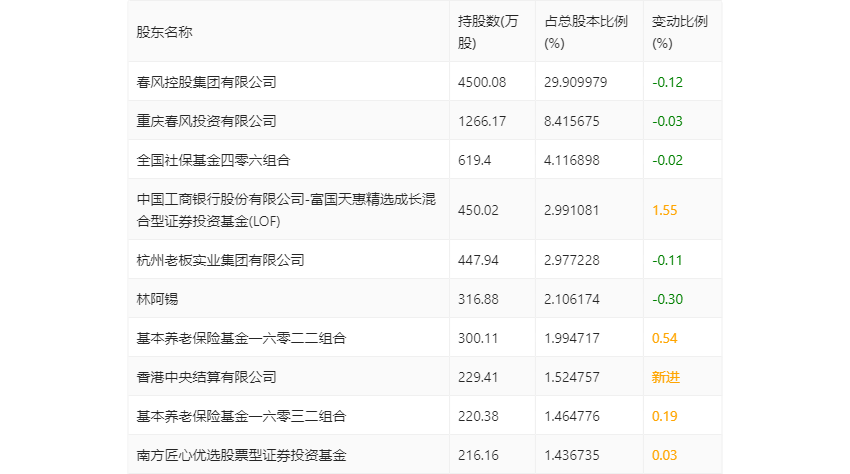 2023年一季度末的公司十大流通股东中,新进股东为香港中央结算有限公司,取代了此前的富国天益价值混合型证券投资基金。在具体持股比例上,中国工商银行股份有限公司-富国天惠精选成长混合型证券投资基金(LOF)、基本养老保险基金一六零二二组合、基本养老保险基金一六零三二组合、南方匠心优选股票型证券投资基金持股有所上升,春风控股集团有限公司、重庆春风投资有限公司、全国社保基金四零六组合、杭州老板实业集团有限公司、林阿锡持股有所下降。