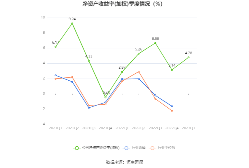 2023年一季度,公司加权平均净资产收益率为4.78%,同比上升1.91个百分点,环比上升1.64个百分点。