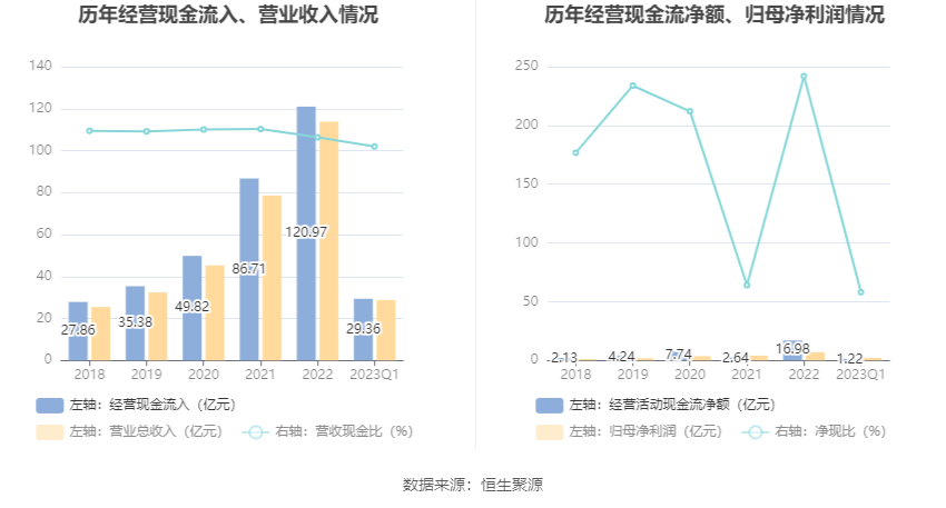 2023年一季度,公司营业收入现金比为101.98%,净现比为58.00%。