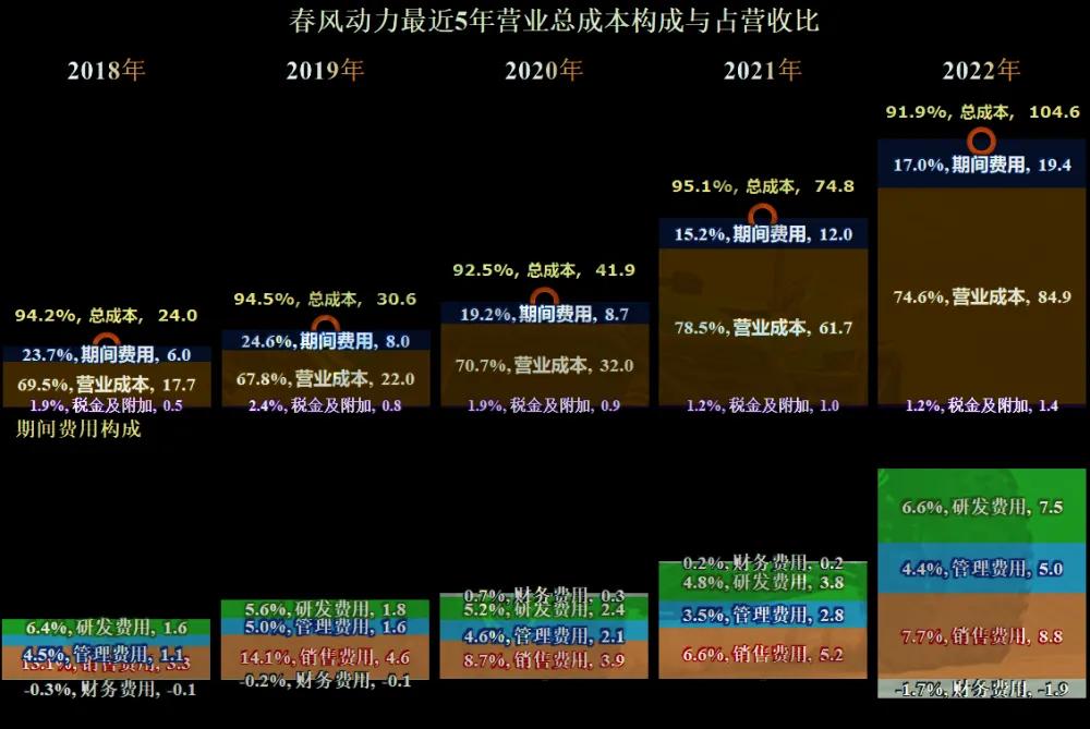 但是,2022年,春风动力并没有发挥出来规模优势,其期间费用占营收比还上升了1.8个百分点。由于毛利率的上升超过期间费用占比的上升,其主营业务的盈利空间在近五年中首次超过8个百分点。我认为其现在的规模基本上达到了一个“最优”的状态,也就是说再高和再低的营收规模都有可能会出现盈利空间下降的状态。