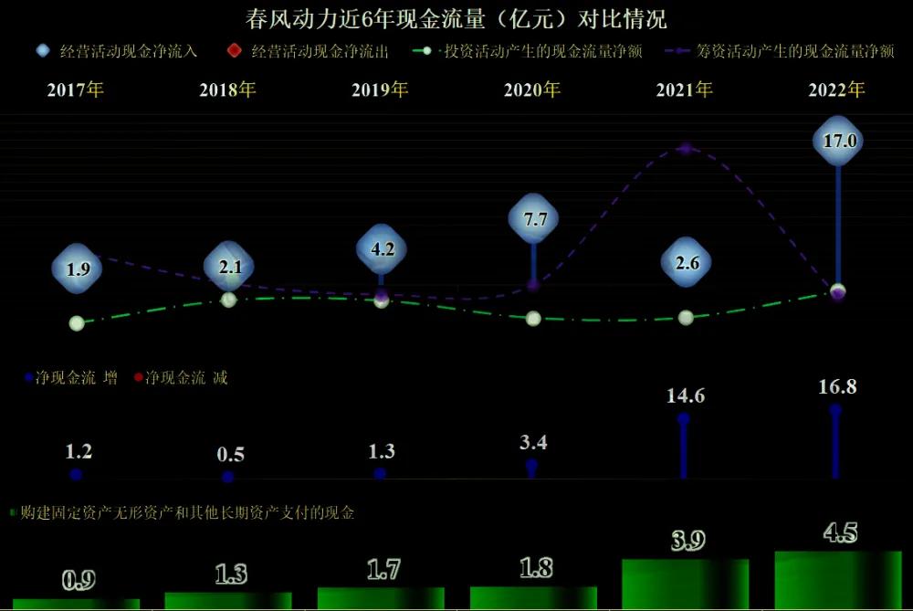 其现金流量来了一个大逆转,经营活动的净现金流,净流入了17亿元,摆脱了2021年流入较少的不利形势。