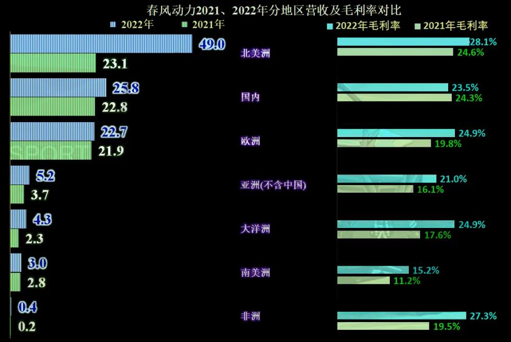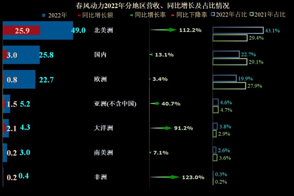 国内市场的销售收入同比增长为13.1%,远低于平均增长水平,这就导致其占比已经只有22.7%了。国外市场中,最大的北美洲市场增长翻倍,占比超过了四成,欧洲市场增长更慢,占比也跌至20%以内。其他的市场均有所增长,但体量相对较小,影响有限。