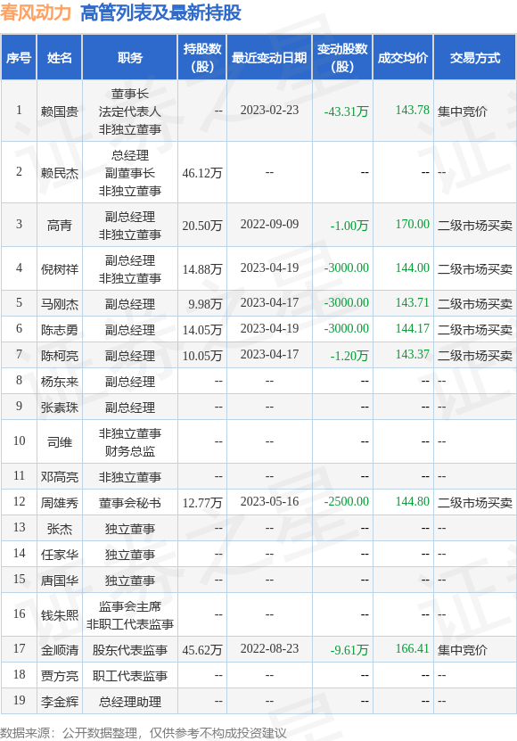 证券之星讯,根据6月5日市场公开信息、上市公司公告及交易所披露数据整理,春风动力(603129)最新董监高及相关人员股份变动情况:2023年5月15日公司高级管理人员马刚杰、高级管理人员周雄秀共减持公司股份5500.0股,占公司总股本为0.0037%。变动期间公司股价上涨3.96%,5月15日当日收盘报141.1元。