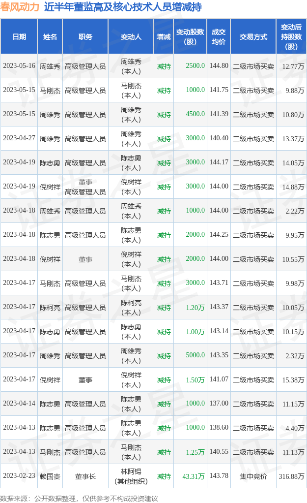 春风动力近半年内的董监高及核心技术人员增减持详情如下: