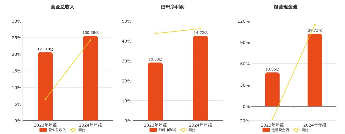 公司营业总收入为150.38亿元。归母净利润为14.72亿元。经营活动现金净流入为29.73亿元。