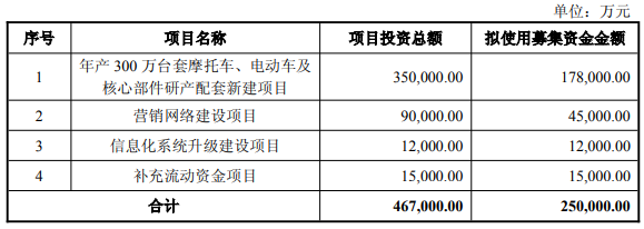 中国经济网北京4月29日讯春风动力(603129.SH)昨晚披露的向不特定对象发行可转换公司债券预案显示,公司本次向不特定对象发行可转换公司债券拟募集资金总额不超过人民币250,000.00万元(含本数),扣除发行费用后募集资金净额将用于投资以下项目:“年产300万台套摩托车、电动车及核心部件研产配套新建项目”“营销网络建设项目”“信息化系统升级建设项目”“补充流动资金项目”。