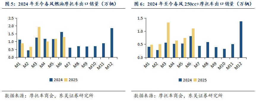 根据摩托车商会数据,2025H1公司燃油摩托车总销量14.3万辆,同比+9%,其中250cc+摩托车总销量10.8万辆,同比+45%。内销方面,2025H1公司燃油摩托车内销销量7.3万辆,同比+16%,其中250cc+摩托车内销销量6.1万辆,同比+37%;出口方面,2025H1公司燃油摩托车出口销量7.0万辆,同比+4%,其中250cc+摩托车出口销量4.8万辆,同比+55%。