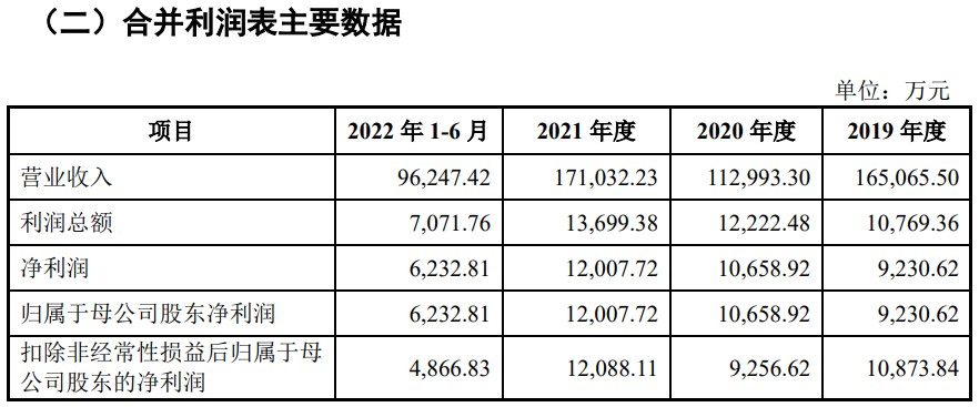 财务方面,于2019年度、2020年度、2021年度,2022年上半年公司分别实现营业收入16.51亿元、11.3亿元、17.1亿元、9.62亿元人民币,净利润9230.62万元、1.07亿元、1.2亿元、6232.81万元人民币。