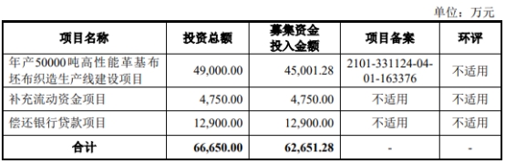 云中马2022年10月18日披露的招股书显示,公司原拟募资62,651.28万元,用于“年产50000吨高性能革基布坯布织造生产线建设项目”、“补充流动资金项目”、“偿还银行贷款项目”。
