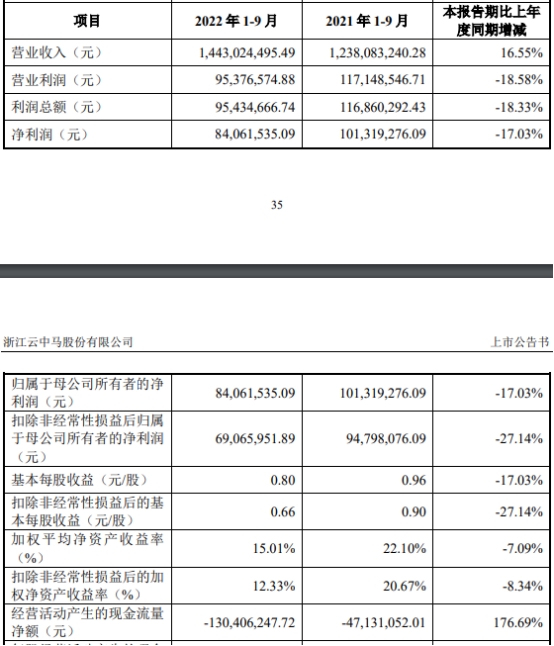 以上同期,云中马净利润/归属于母公司股东净利润分别为9,230.62万元、10,658.92万元、12,007.72万元、6,232.81万元,扣除非经常性损益后归属于母公司股东的净利润分别为10,873.84万元、9,256.62万元、12,088.11万元、4,866.83万元,经营活动产生的现金流量净额分别为10,765.38万元、13,408.11万元、13,599.14万元、3,911.32万元,净现比分别为1.17、1.26、1.13、0.63。