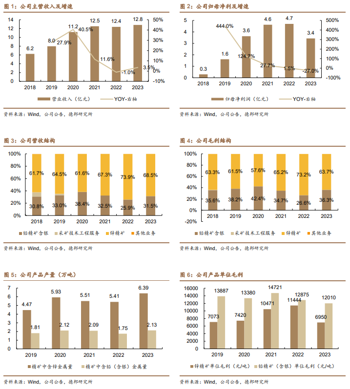 2023年锌价下跌14.3%,公司以量补价收入保持稳定。2023年全年铅锭(1#)均价为15612元/吨,较2022年同比上涨3.0%;锌锭(0#)均价为21627元/吨,较2022年同比下降14.3%。经我们测算,2023年公司铅精矿(含银)单位售价19065元/吨,同比增加3.2%,单位成本7055元/吨,主要受矿业权出让收益金征收政策的变化影响同比上涨26.2%,单位毛利12010元/吨,较2022年的12875元/吨同比下降6.7%。2023年公司锌精矿单位售价13645元/吨,同比减少19.9%,单位成本6695元/吨,主要受矿业权出让收益金征收政策的变化影响同比上涨19.7%,单位毛利6950元/吨,较2022年的11444元/吨同比下降39.3%。产销量方面,2023年公司生产锌精矿6.39万金属吨,同比增长18.11%,销售6.42万金属吨,同比增长19.57%;公司生产铅精矿(含银)2.13万吨,同比增长22.08%,销售21.16万吨,同比增加21.76%,产量增加主要是收购子公司后产能释放,原矿石产量增加致金属量增加。2023年公司开采铅锌原矿产量为162万吨(2022年为150万吨),增量由谢家沟铅锌矿贡献。