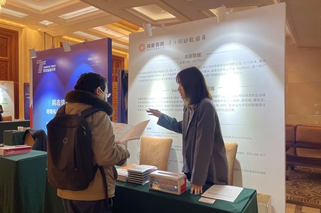 展位上,Vastbase G100数据库产品吸引了众多专家、参会人员的驻足了解,工作人员围绕产品定位、产品应用场景、数据库与高校用户的合作意向等问题与观众进行互动与交流,结束后得到观众的一致认可和肯定。