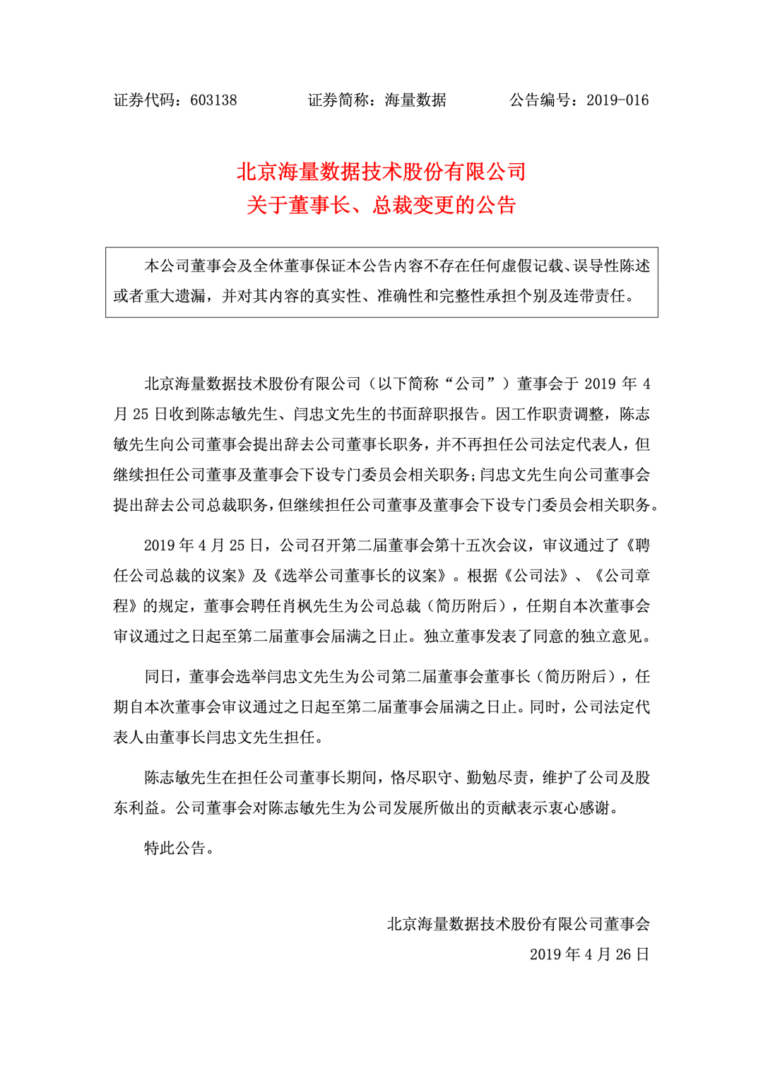 2019 年陈志敏辞任董事长职务: