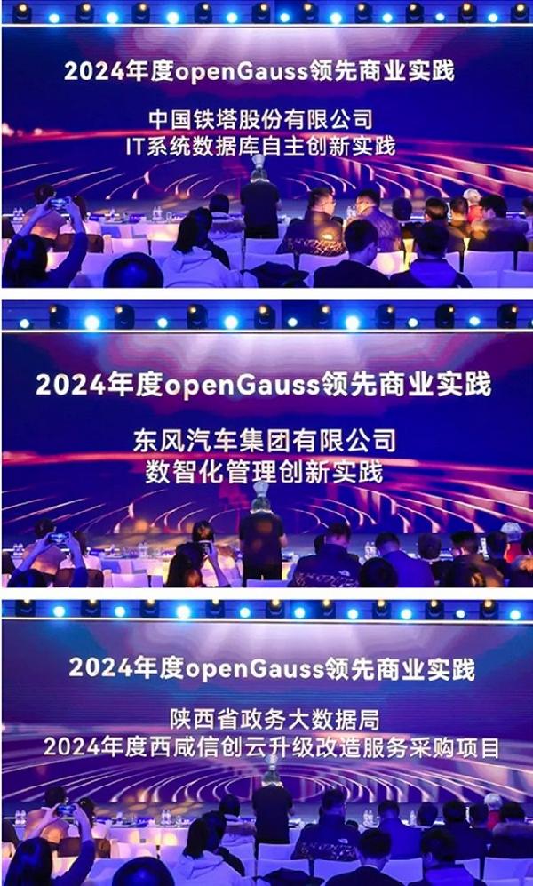 在随后的颁奖仪式上,海量数据库Vastbase应用的多个商业案例脱颖而出,荣获“2024 openGauss领先商业实践案例”奖项。这些案例包括中国铁塔股份有限公司IT系统数据库自主创新实践项目、东风汽车集团有限公司数智化管理创新实践项目、陕西省政务大数据局2024年度西咸政务云升级改造项目等,充分展示了海量数据库Vastbase在各行各业中的广泛应用与卓越表现。