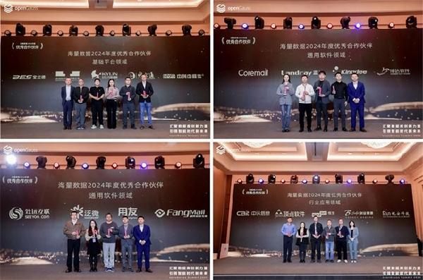 在商业实践方面,海量数据凭借Vastbase的卓越性能与稳定表现,成功助力了众多企业的数字化转型与升级。例如,在首发集团的应用实践中,海量数据库Vastbase作为核心基础数据支撑平台,在适配迁移、数据收集和应用支持方面发挥了关键作用,为交通地理信息、数据共享交换和业务中台等应用提供了坚实保障。此外,Vastbase还助力承德银行打造了新一代交易总账系统,实现了系统的高性能和高可靠;与金蝶携手打造了自主可控的企业级解决方案;与恒生电子联合提出了证券数智化转型一体化方案等。这些成功案例的积累,不仅进一步巩固了海量数据在数据库行业的领先地位,也为其未来的发展奠定了坚实的基础。在伙伴合作方面,海量数据始终秉持开放合作的理念,与众多生态伙伴建立了紧密的合作关系。截至目前,海量数据已服务1000+用户,合作1000+生态伙伴,客户增长率达110%,产业生态圈持续壮大。在海量数据专场的颁奖典礼上,海量数据向基础平台、通用软件、行业应用三大领域的优秀合作伙伴们颁发了奖项,以表彰他们在推动数据库产业发展中所做出的杰出贡献。