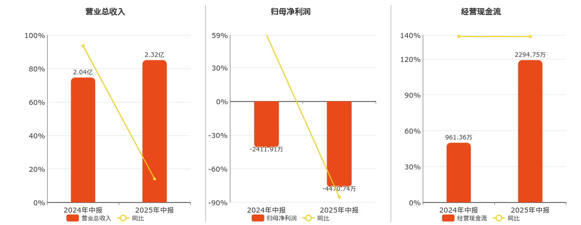 公司营业总收入为2.32亿元,较去年同报告期营业总收入增加2850.59万元,实现2年连续上涨,同比较去年同期上涨13.98%。归母净利润为-4470.74万元。经营活动现金净流入为2294.75万元,较去年同报告期经营活动现金净流入增加1333.39万元,实现4年连续上涨,同比较去年同期上涨138.70%。