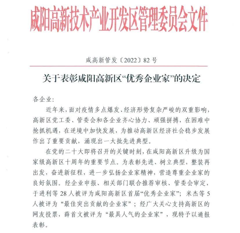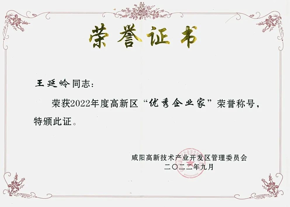 9月25日上午,咸阳高新区管委会举行“喜迎二十大高新这十年”高新区升级十年暨高质量发展推进大会,回顾总结升级国家高新区的十年历程,展望未来发展,表彰优秀企业家和高新工匠,动员高新区上下以饱满的精神状态和实际行动迎接党的二十大胜利召开。公司董事长王延岭被评为咸阳高新区首届“优秀企业家”。