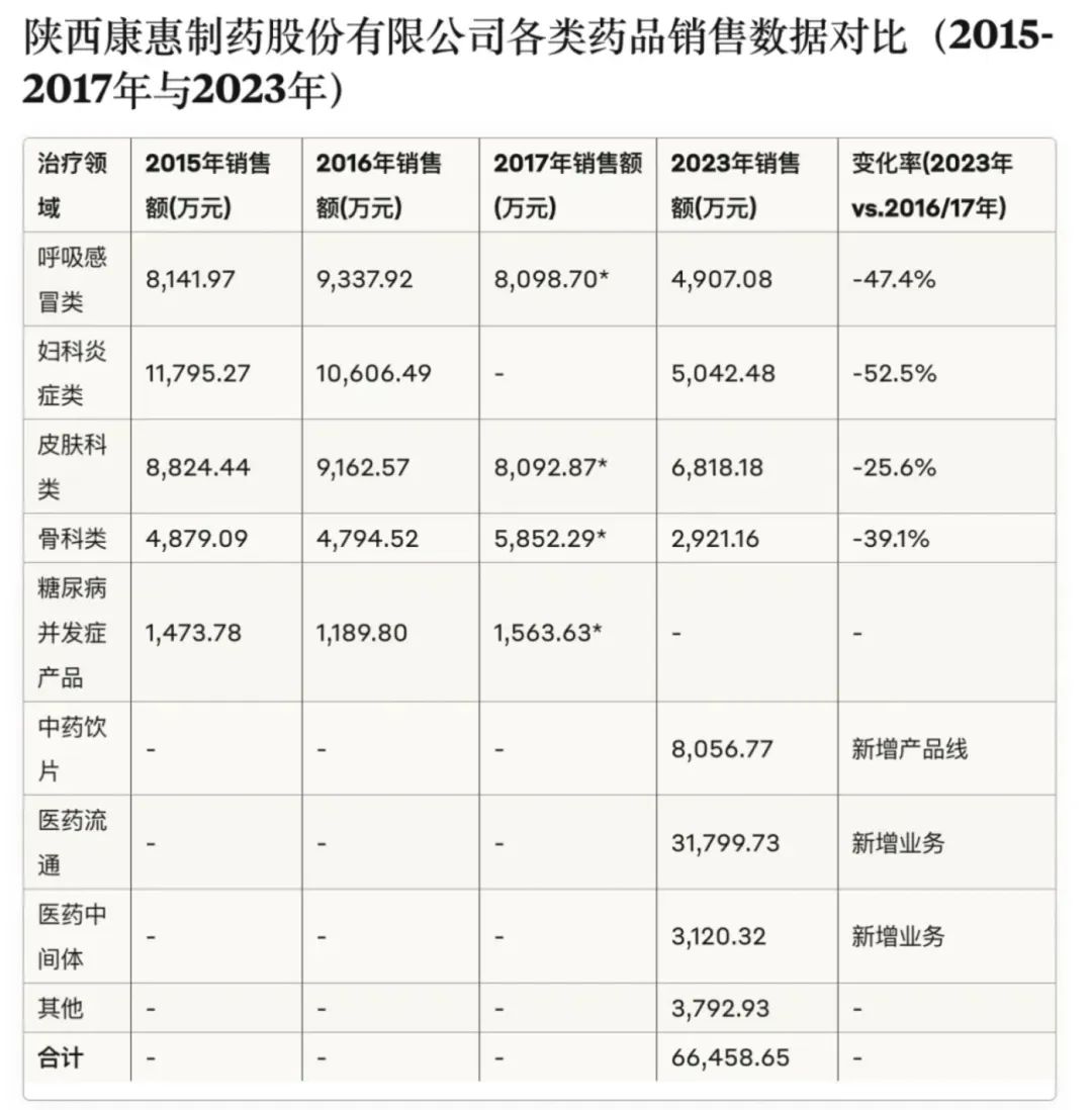 此时,呼吸感冒类中成药市场已接近固化为头部通吃的格局,再想挤进去难度巨大。康惠制药其他几个类别包括妇科、皮肤科、骨科面临的情况大同小异,治糖尿病的“芪药消渴胶囊”2017年卖出1500多万的年销售额,现已从财报中消失。